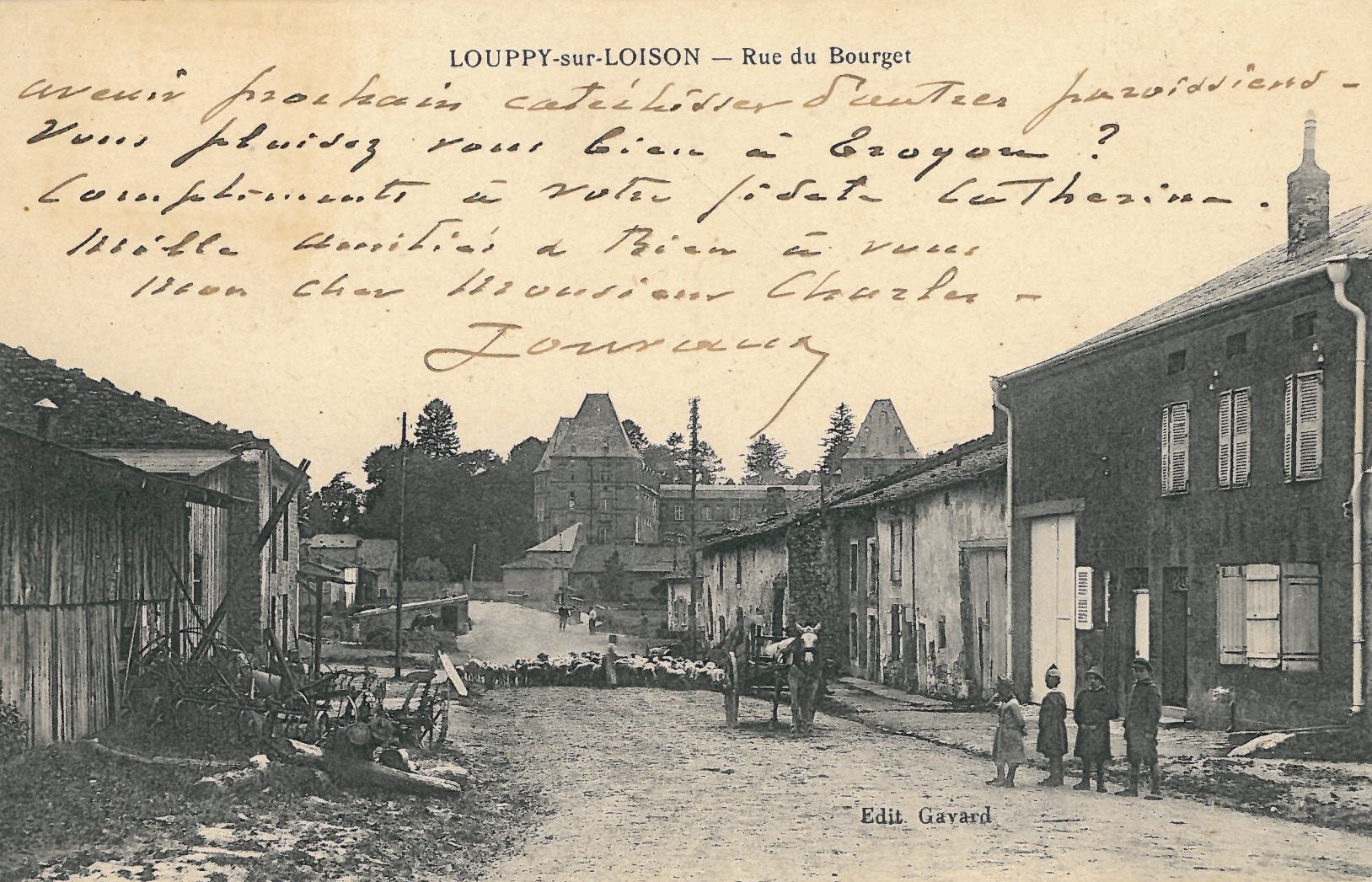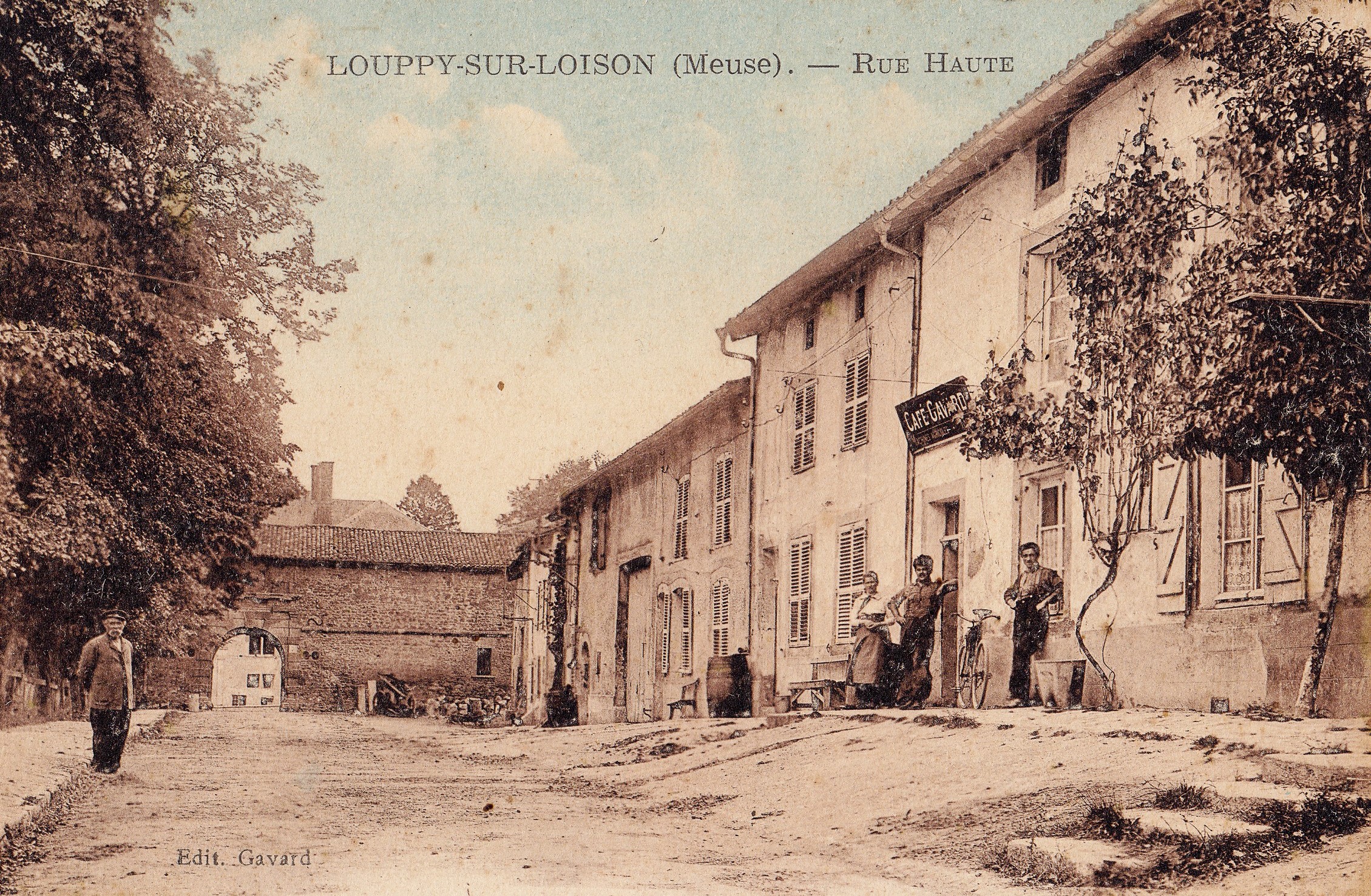À la place des arbres dans la rue de la Tinette, une rangée de maisons demeurait dans l’alignement de celle de la route. L’ensemble est incendié et détruit à la guerre de 1914. En rue haute, vers le château renaissance, se trouvait dans son milieu, une poste, le café Gavard, la mairie, l’école des filles et celle des garçons. L’ensemble ajoutait à cette place, beaucoup de moments de joie, de rencontres et de rassemblements. Une vie sociale d’antan à prendre en exemple.